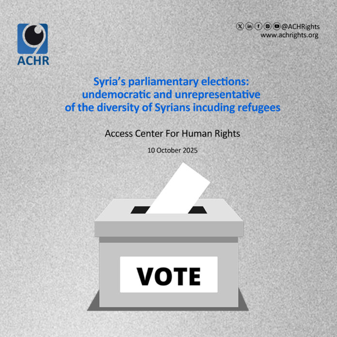 The Access Center for Human Rights (ACHR) expresses deep concern over the structure and nature of the parliamentary elections held in Syria. While many have deemed the elections as a defining step in the country’s political transition, ACHR maintains that these elections remain undemocratic and unrepresentative of the diversity of Syrians, many of whom continue to be displaced and remain refugees. At this significant transitionary period in Syria’s history, the inclusion of a wide spectrum of representation and voices through a democratic electoral process is fundamental to fostering civic values, pluralism and the principles of democratic participation.